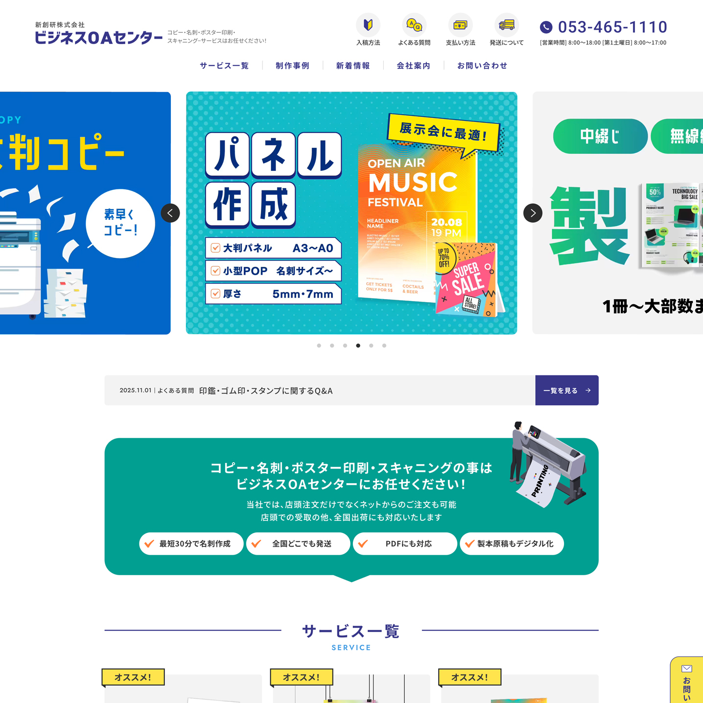 図面・資料のコピーから、書籍の制作まで幅広くサービスを展開されている、静岡県浜松市の新創研株式会社 ビジネスOAセンター様のサービスサイトのリニューアルをお手伝いさせていただきました。
